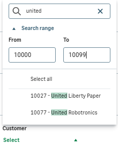 Example of a combined searchUnited Liberty Paper is a new customer that Patrick needs to consider in his plan for next year. The FP&A analyst wants to add the customer to Patrick's permissions but can't remember the full customer name. The analyst remembers the customer account starts with 100 and the name begins with united. A quick text search for united combined with a search range of 10000 to 10099 shows only two results.