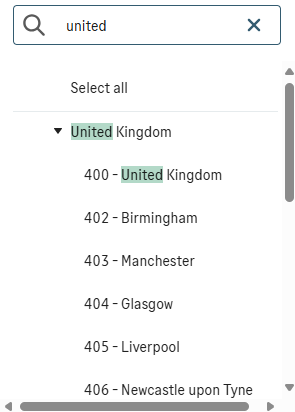 If you select a parent value, a checkmark also appears next to all its child values in the search results.